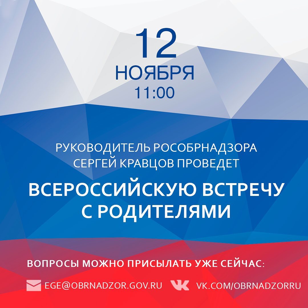 07.10.201912 ноября в 11:00 пройдёт Всероссийская встреча с родителями, в ходе которой Сергей Кравцов и специалисты Рособрнадзора ответят на все вопросы о ЕГЭ, ГИА-9, НИКО и ВПР, а также об исследованиях по стандартам PISA и о других актуальных темах в 2020 году.⠀Вопросы уже принимаются по электронной почте – ege@obrnadzor.gov.ru и в разделе «Обсуждения» на официальной странице Рособрнадзора в «ВКонтакте». Ссылка в шапке профиля.⠀Ответы на самые волнующие вопросы будут даны в ходе встречи. Не пропустите онлайн-трансляцию на официальном канале Рособрнадзора в YouTube